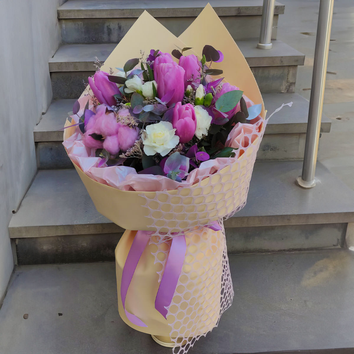 Тюльпан розовый, эустома белая, хлопок, эвкалипт. Упаковка (лента, пленка, крафт, сетка, пленка матовая)