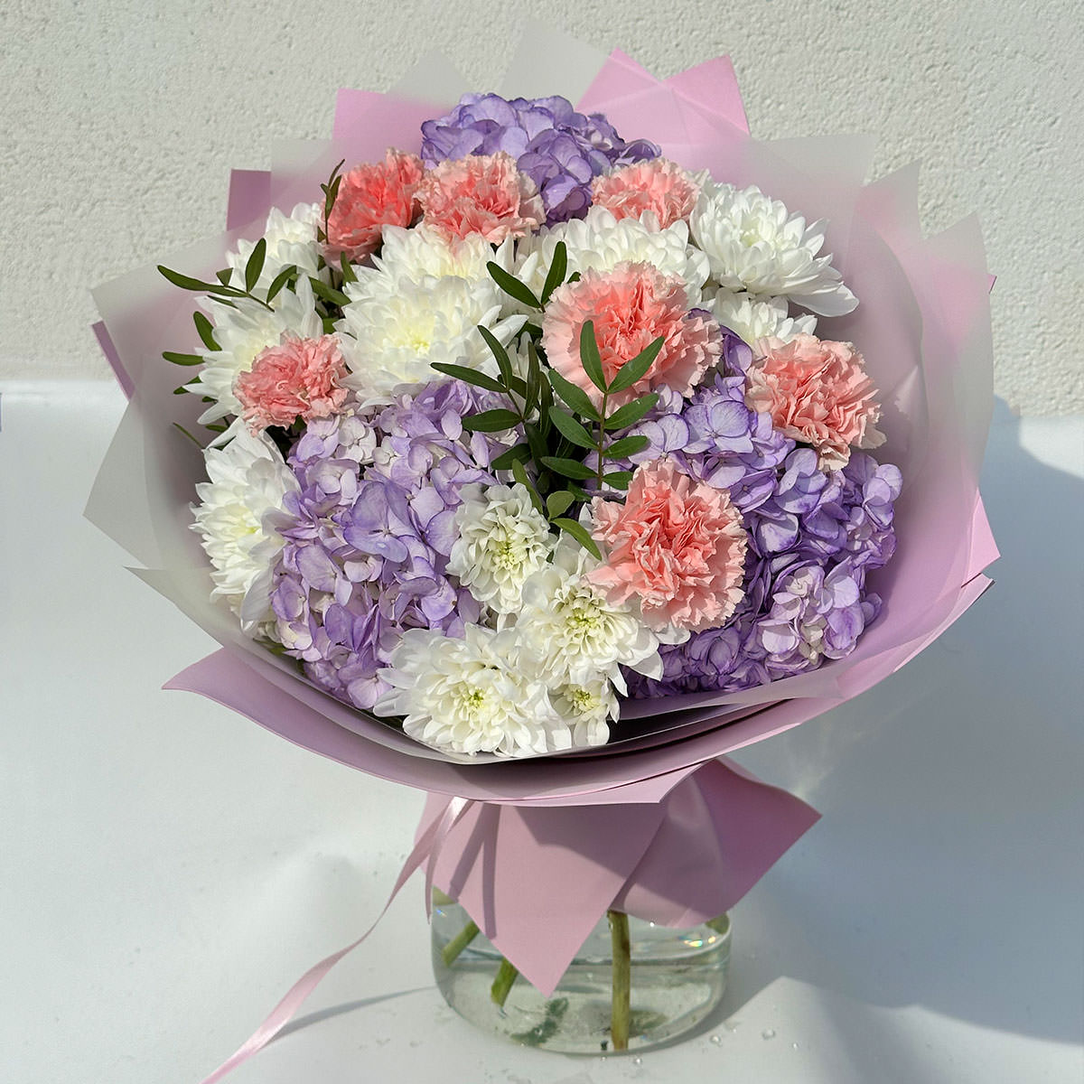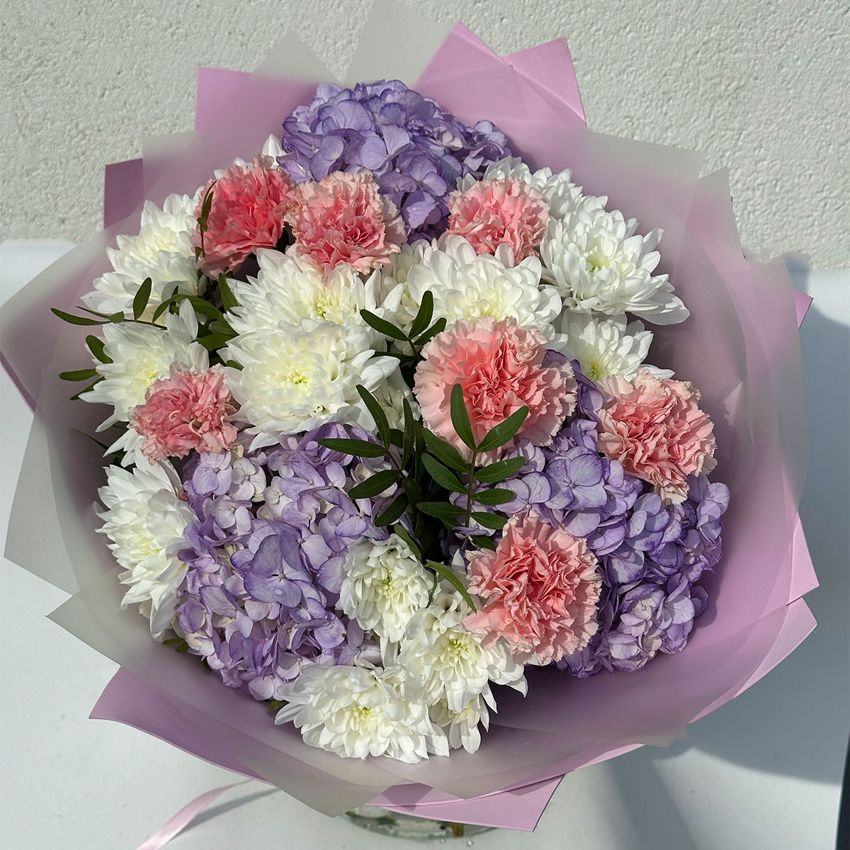 Гортензия фиолетовая, гвоздика розовая, хризантема кустовая белая, фисташка. Упаковка (лента, пленка, крафт, сетка, пленка матовая)