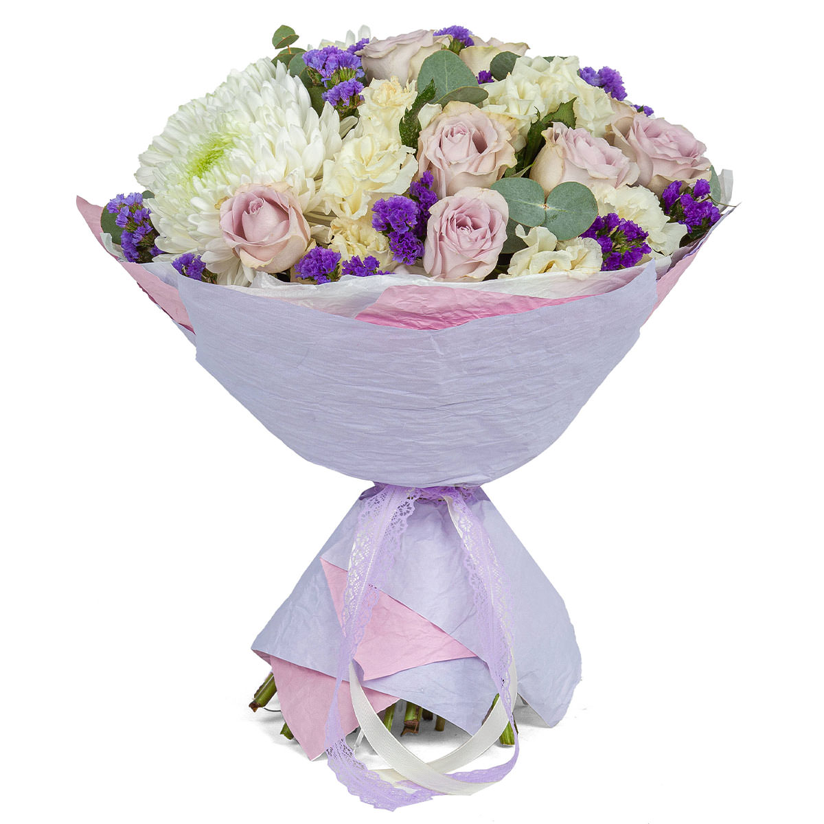 Роза одноголовая сиреневая, хризантема одноголовая белая, эустома кремовая, статица, эвкалипт. Упаковка (лента, пленка, крафт, сетка, пленка матовая)