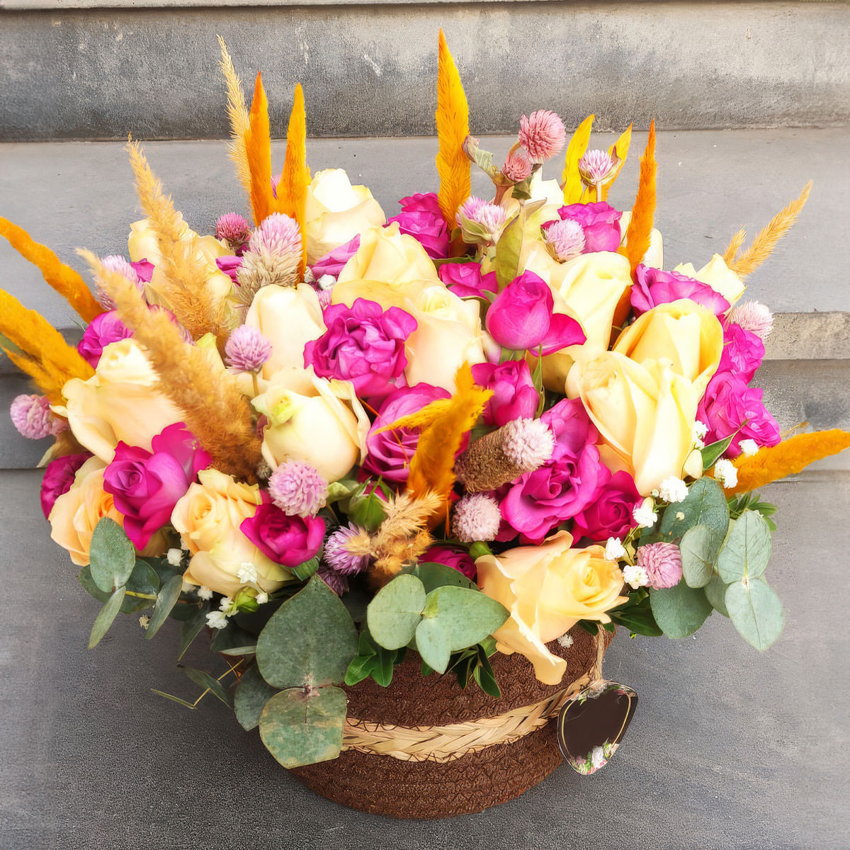 Роза одноголовая кремовая и розовая, сухоцвет, гипсофила, эвкалипт. Упаковка (Корзина, оазис, ящик).